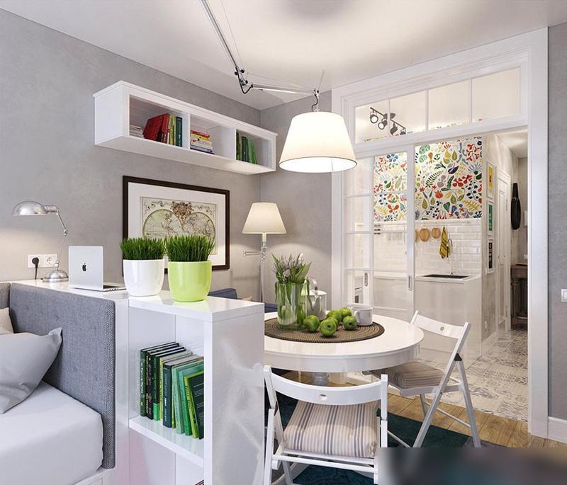 其次,餐桌的挑选上也不需要去选择大尺寸的餐桌, 因为小空间如果选择太大的家具会显得压抑,我们可以去考虑这种小巧精致的圆形餐桌,圆形的外观设计不会有硬朗的边角,看上去更加友好,而且圆形的餐桌也适合两个人围坐在一起进行用餐。